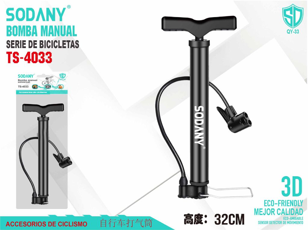 La bomba manual SODANY TS-4033 es una herramienta de inflado eficiente para bicicletas, diseñada para uso diario y fácil transporte. Con una altura de 32 cm, proporciona una presión adecuada para inflar rápidamente las ruedas de la bicicleta. Su diseño robusto y ligero, junto con el mango ergonómico, hace que sea cómoda de usar. Incluye un soporte para mantener la bomba en su lugar cuando no está en uso.