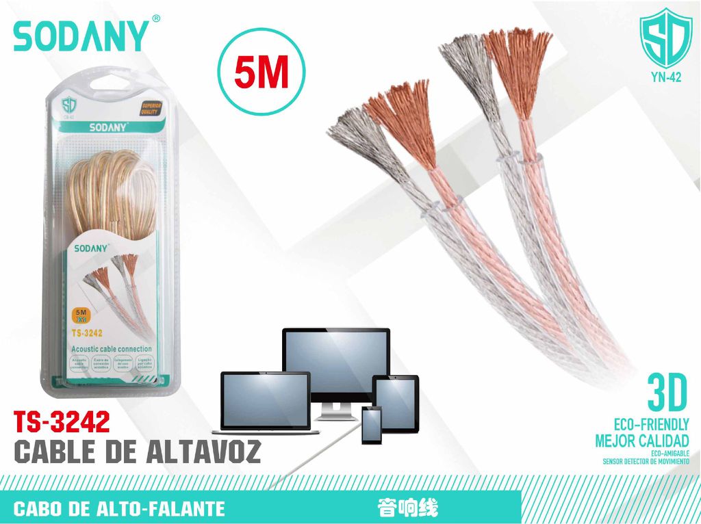 El cable de altavoz SODANY TS-3242 es una excelente opción para la conexión de equipos de audio, proporcionando un sonido de alta calidad con una transmisión clara y sin interferencias. Con una longitud de 5 metros, este cable ofrece la flexibilidad necesaria para instalaciones en entornos domésticos y profesionales, permitiendo conectar altavoces a dispositivos como amplificadores, receptores y sistemas de cine en casa con facilidad.