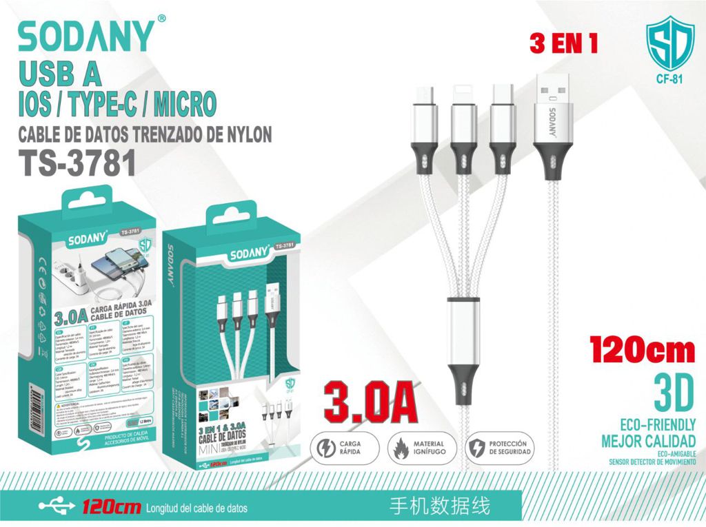 SODANY Cable de Datos Trenzado de Nylon 3 en 1 TS-3781
