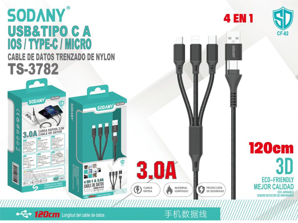 El cable de datos SODANY TS-3782 es una solución avanzada y versátil para cargar y transferir datos de múltiples dispositivos. Equipado con conectores USB, Type C, Micro USB e iOS, este cable 4 en 1 es ideal para cualquier usuario con varios dispositivos electrónicos. Su longitud de 1.2 metros proporciona la flexibilidad necesaria para utilizarlo cómodamente en cualquier lugar. Fabricado con material de nylon trenzado, es resistente y duradero, asegurando un rendimiento óptimo a largo plazo. Además, cuenta con una capacidad de carga rápida de 3.0A, que permite cargar dispositivos en menor tiempo y con mayor eficiencia.