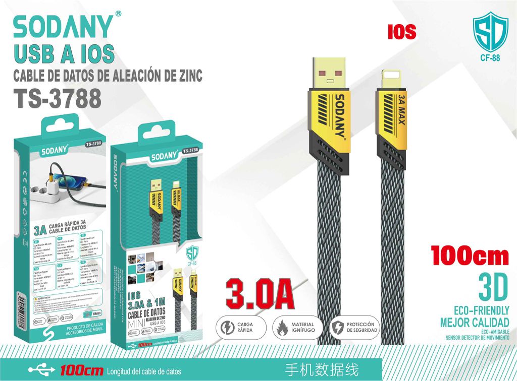 El cable de datos SODANY TS-3788 ofrece una solución ideal para cargar y transferir datos de manera rápida y eficiente en dispositivos iOS. Fabricado con materiales de alta calidad, como la aleación de zinc y el nylon trenzado, este cable garantiza durabilidad y resistencia al uso diario. Su capacidad de carga rápida de 3.0A lo convierte en una excelente opción para quienes buscan optimizar el tiempo de carga.