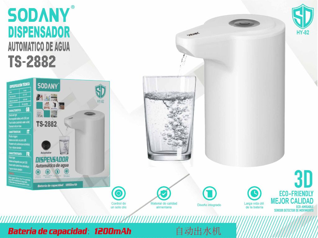 El dispensador automático de agua SODANY TS-2882 es una herramienta cómoda y práctica para dispensar agua de garrafas y botellas grandes. Con su batería recargable de 1200mAh y su diseño minimalista, este dispensador es ideal para el uso diario en el hogar, la oficina o cualquier lugar donde necesites un acceso rápido al agua potable. Su funcionamiento automático con un solo toque y su boquilla integrada permiten un flujo de agua controlado y sin derrames.