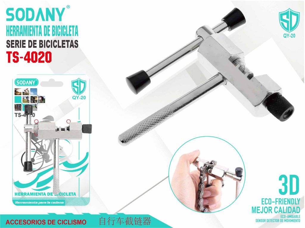 La herramienta para bicicleta SODANY TS-4020 está diseñada para desmontar y ajustar cadenas de bicicleta de manera eficiente. Es un accesorio indispensable para los ciclistas que deseen mantener su bicicleta en óptimas condiciones. Su diseño compacto facilita el transporte, por lo que puedes llevarla contigo durante tus paseos en bicicleta.