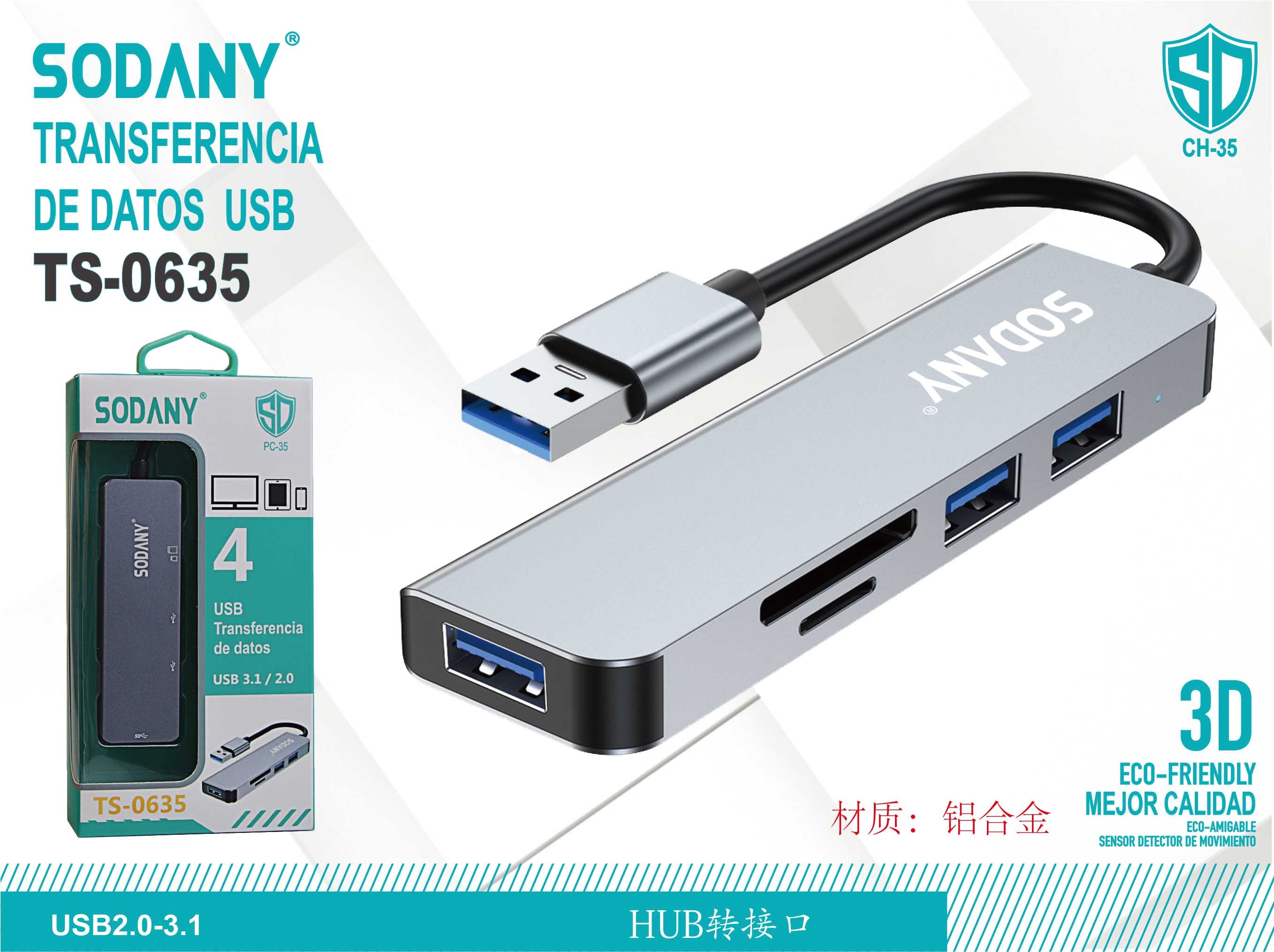 El hub de transferencia de datos USB SODANY TS-0635 es un dispositivo eficiente y elegante, diseñado para expandir la conectividad de tus dispositivos con puerto USB estándar. Con un cuerpo de aluminio resistente y 4 puertos USB, este hub es ideal para usuarios que buscan una solución robusta y moderna para conectar múltiples dispositivos.