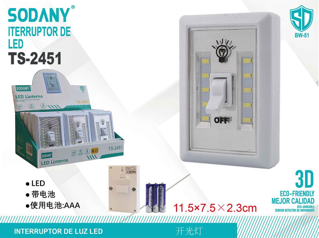 El SODANY Interruptor de LED TS-2451 es una lámpara LED compacta y funcional que cuenta con un interruptor tipo palanca, ideal para iluminar espacios pequeños de manera rápida y eficiente. Con un diseño que simula un interruptor tradicional, ofrece la conveniencia de una luz LED sin necesidad de instalación eléctrica complicada. Perfecto para armarios, gabinetes, o cualquier lugar oscuro.