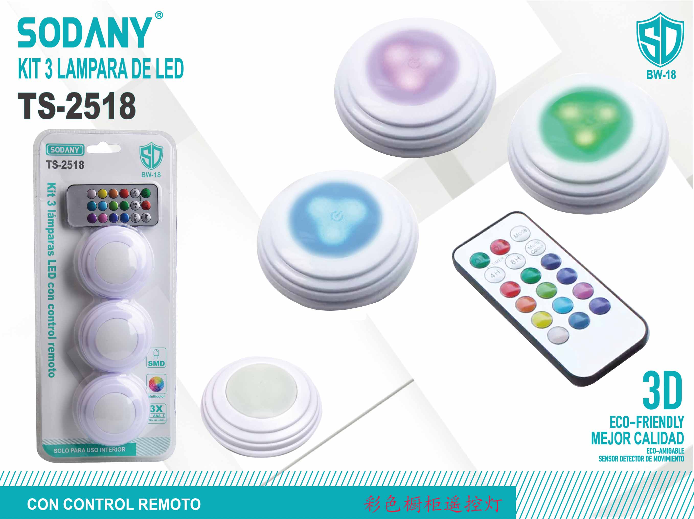 El Kit de 3 Lámparas LED SODANY TS-2518 con control remoto ofrece una iluminación versátil y de múltiples colores para mejorar la atmósfera de cualquier espacio. Este conjunto de lámparas LED permite cambiar entre diferentes tonos y modos de luz mediante un control remoto, lo que lo convierte en una excelente opción tanto para la decoración de interiores como para una iluminación funcional en espacios como armarios, pasillos y más.