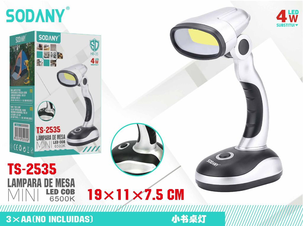 La lámpara de mesa SODANY TS-2535 es una solución compacta y portátil para iluminar espacios pequeños como escritorios, mesas de noche o áreas de trabajo. Equipada con tecnología LED COB, proporciona una luz clara y brillante de 6500K que simula la luz del día, ideal para actividades que requieren concentración y precisión. Con un diseño ergonómico, esta lámpara se adapta fácilmente a cualquier entorno gracias a su tamaño reducido y su funcionamiento a pilas.