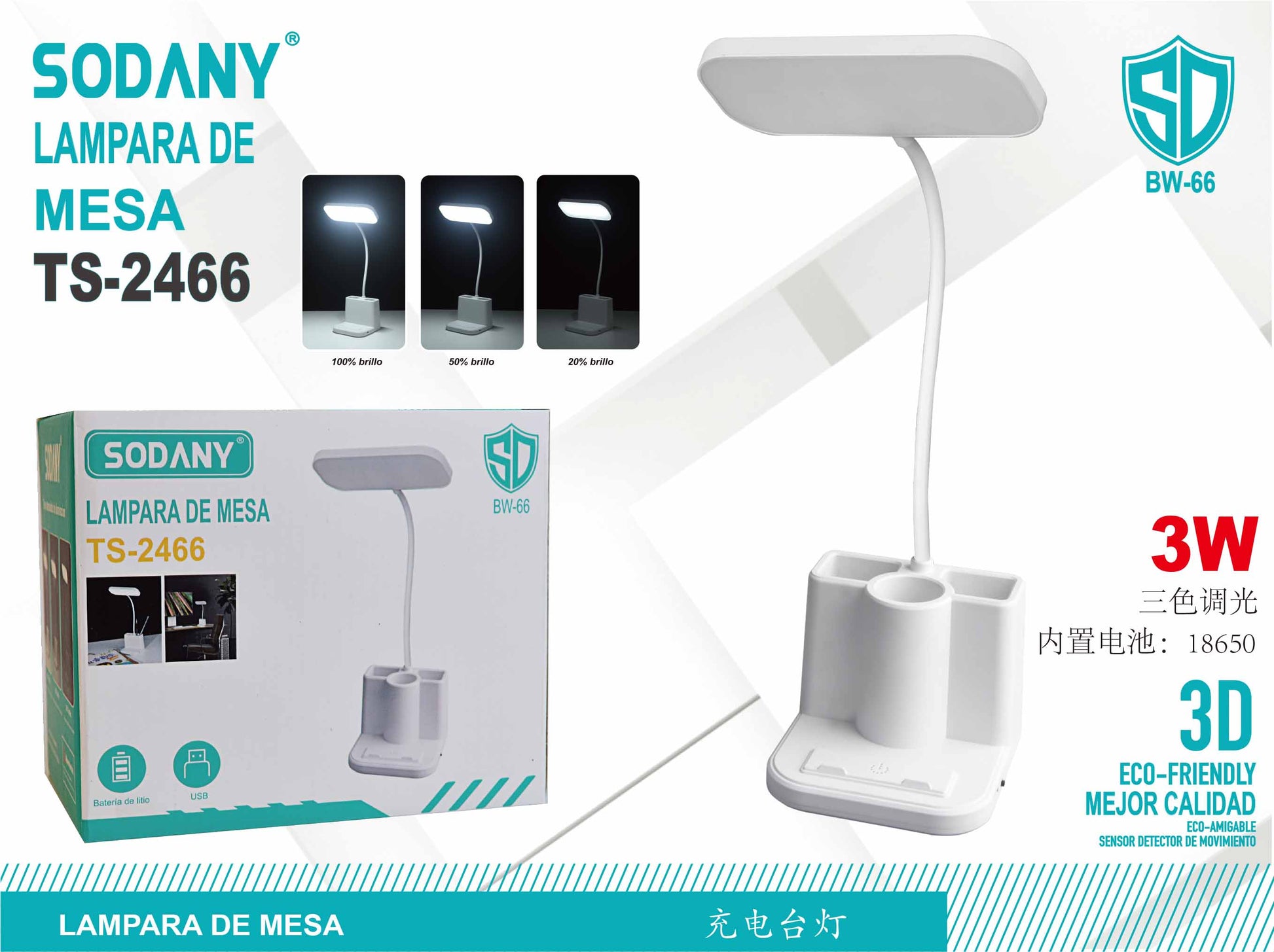 La lámpara de mesa SODANY TS-2466 es una solución de iluminación moderna y funcional, diseñada para proporcionar una luz eficiente y ajustable en cualquier espacio. Con un diseño minimalista y eco-friendly, esta lámpara es perfecta para escritorios, mesitas de noche y áreas de trabajo. Además, incorpora un soporte para bolígrafos, ideal para organizar tu escritorio.