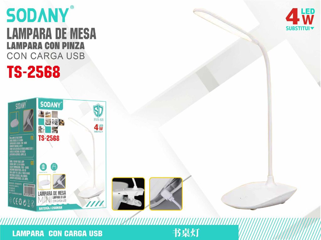 La lámpara de mesa SODANY TS-2568 está diseñada para ofrecer una iluminación eficiente y flexible, ideal para leer o trabajar en cualquier espacio. Con un diseño elegante y moderno, esta lámpara incluye una pinza para sujetarse fácilmente en escritorios o superficies. Además, es recargable mediante USB, lo que garantiza un uso portátil y práctico.