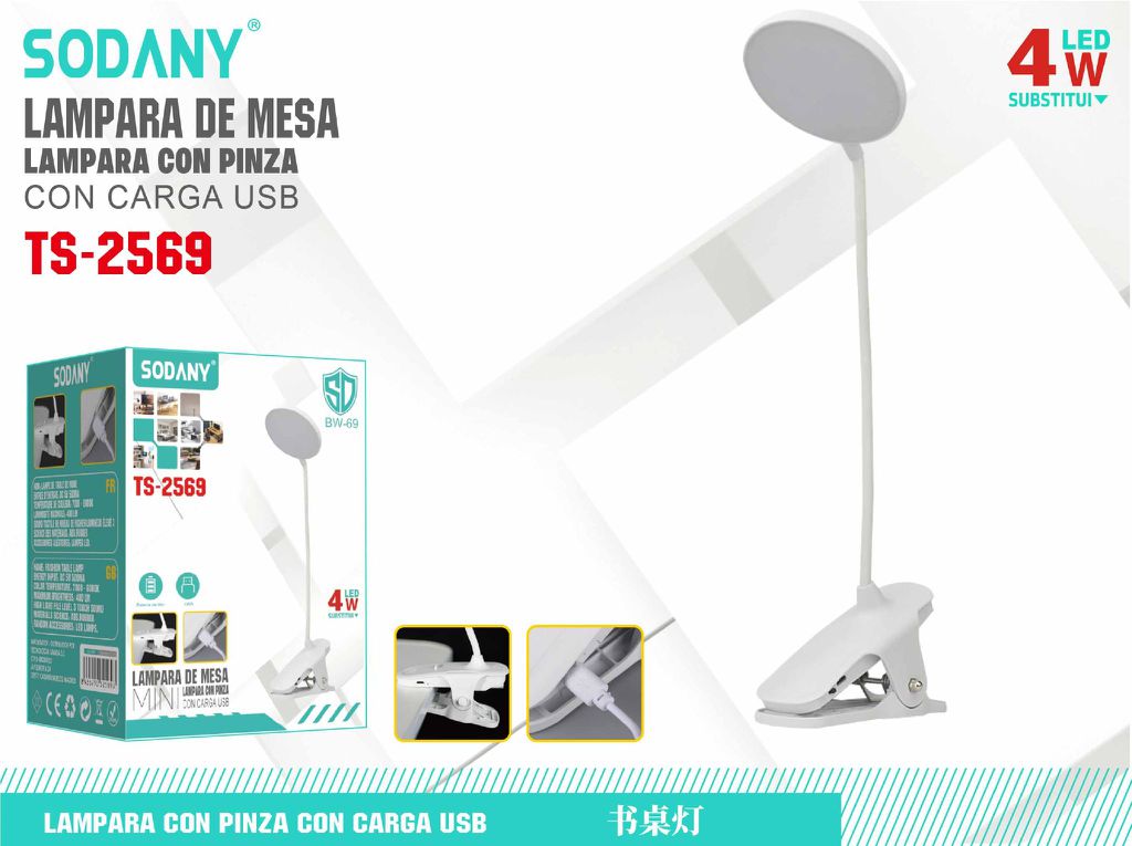 La SODANY TS-2569 es una lámpara de mesa con un diseño moderno y funcional, equipada con una pinza de agarre y carga USB, perfecta para espacios reducidos como escritorios, mesas de estudio o para la lectura en cama. Su luz LED de 4W proporciona una iluminación eficiente y cómoda, ideal para tareas que requieren concentración. La pinza permite fijar la lámpara en superficies delgadas como estantes o escritorios, lo que optimiza el espacio disponible.
