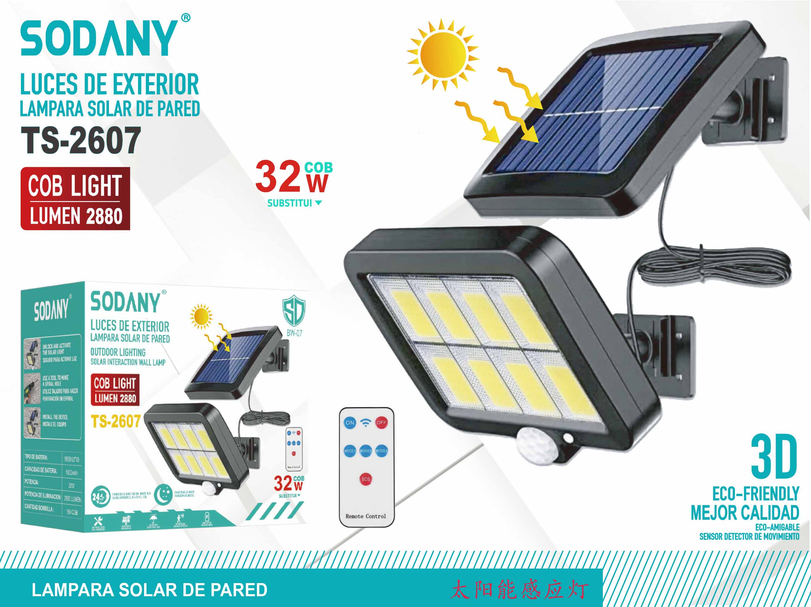 La Lámpara Solar de Pared SODANY TS-2607 está diseñada para iluminar exteriores de manera eficiente y ecológica. Con una impresionante potencia de 32W y 2880 lúmenes, ofrece una iluminación fuerte y confiable. Este modelo incluye un panel solar separado para maximizar la eficiencia de la recarga solar y un control remoto para mayor comodidad en su uso. Ideal para jardines, patios y entradas, cuenta con un sensor de movimiento que activa la luz solo cuando es necesario, ahorrando energía.