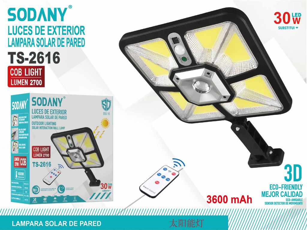 La Lámpara Solar de Pared SODANY TS-2616 es una poderosa luminaria que utiliza tecnología COB Light para ofrecer una iluminación de alta calidad y eficiencia. Con una impresionante salida de luz de 2700 lúmenes y 30W de potencia, esta lámpara solar está diseñada para iluminar de manera efectiva áreas exteriores, brindando seguridad y confort. Además, su batería recargable de 3600 mAh, alimentada por energía solar, garantiza un rendimiento continuo, mientras que su control remoto facilita el ajuste de la luz desde cualquier lugar.