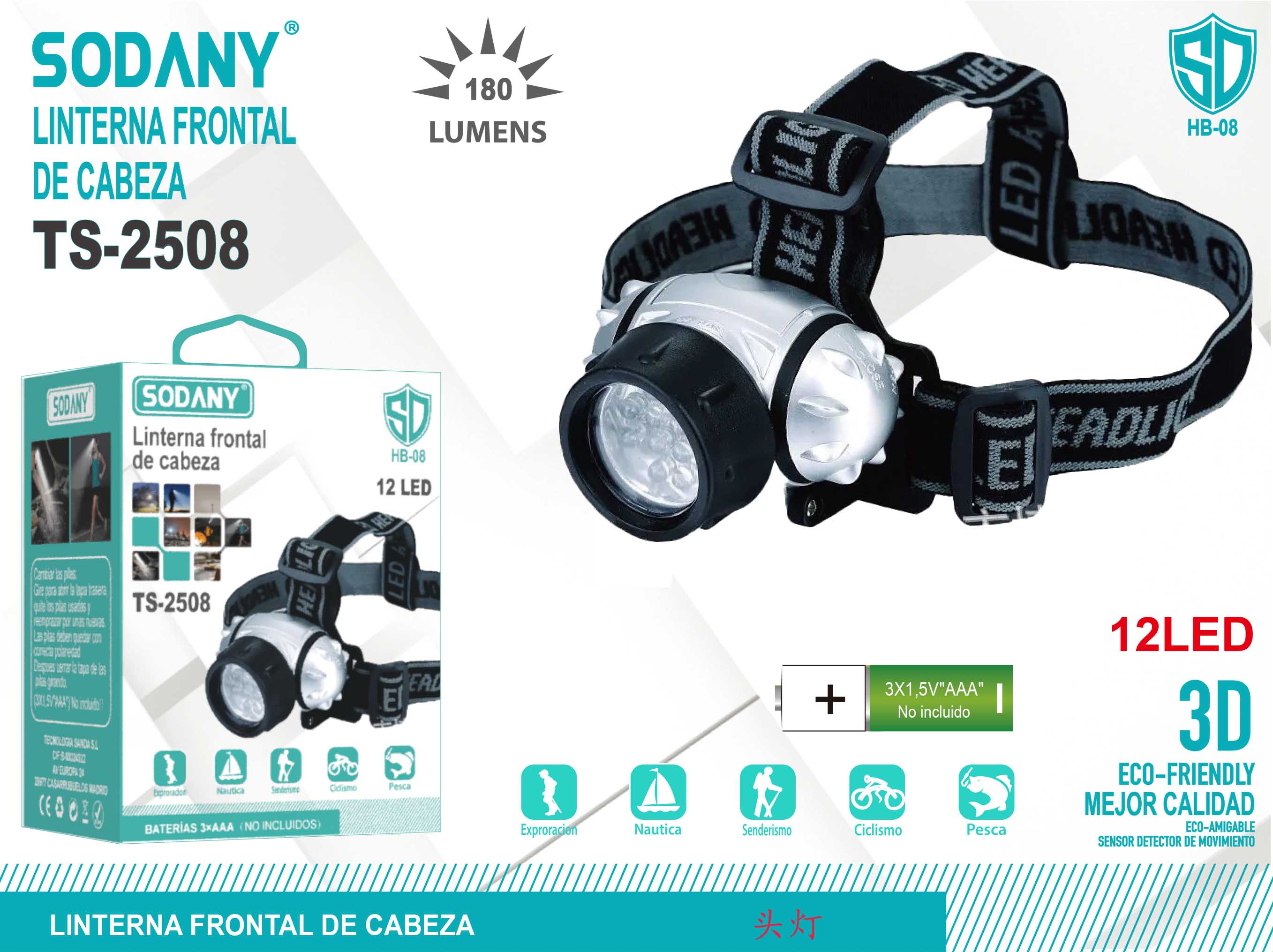 La linterna frontal SODANY TS-2508 cuenta con 12 luces LED que proporcionan una iluminación potente de 180 lúmenes, ideal para actividades al aire libre como la exploración, senderismo, ciclismo y pesca. Esta linterna ofrece una experiencia de manos libres con una correa ajustable, lo que la hace cómoda y segura para usar durante largos periodos. Funciona con 3 pilas AAA (no incluidas).