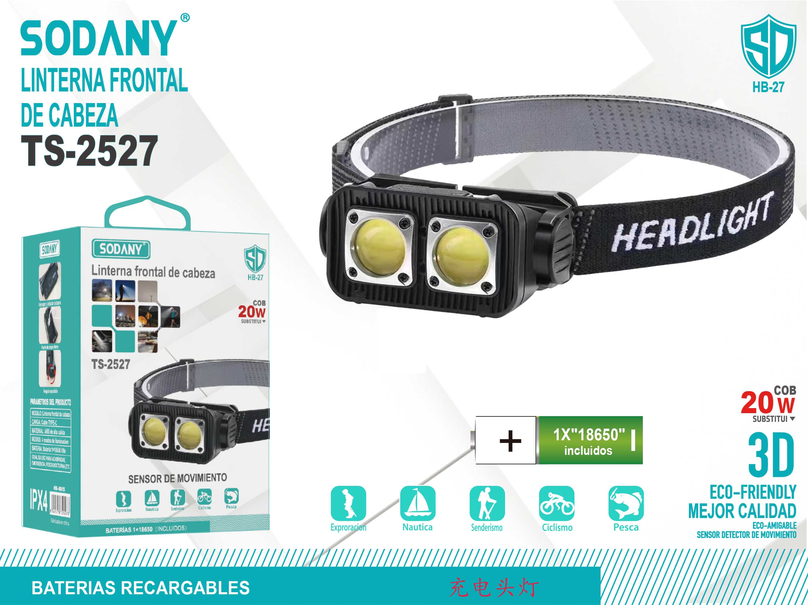 La linterna frontal SODANY TS-2527 es una excelente opción para actividades al aire libre, proporcionando una potente iluminación de 20W con la tecnología COB. Viene equipada con una batería recargable 18650, lo que asegura un uso prolongado y eficiente. Esta linterna es resistente al agua con clasificación IPX4, lo que la hace ideal para todo tipo de condiciones climáticas.