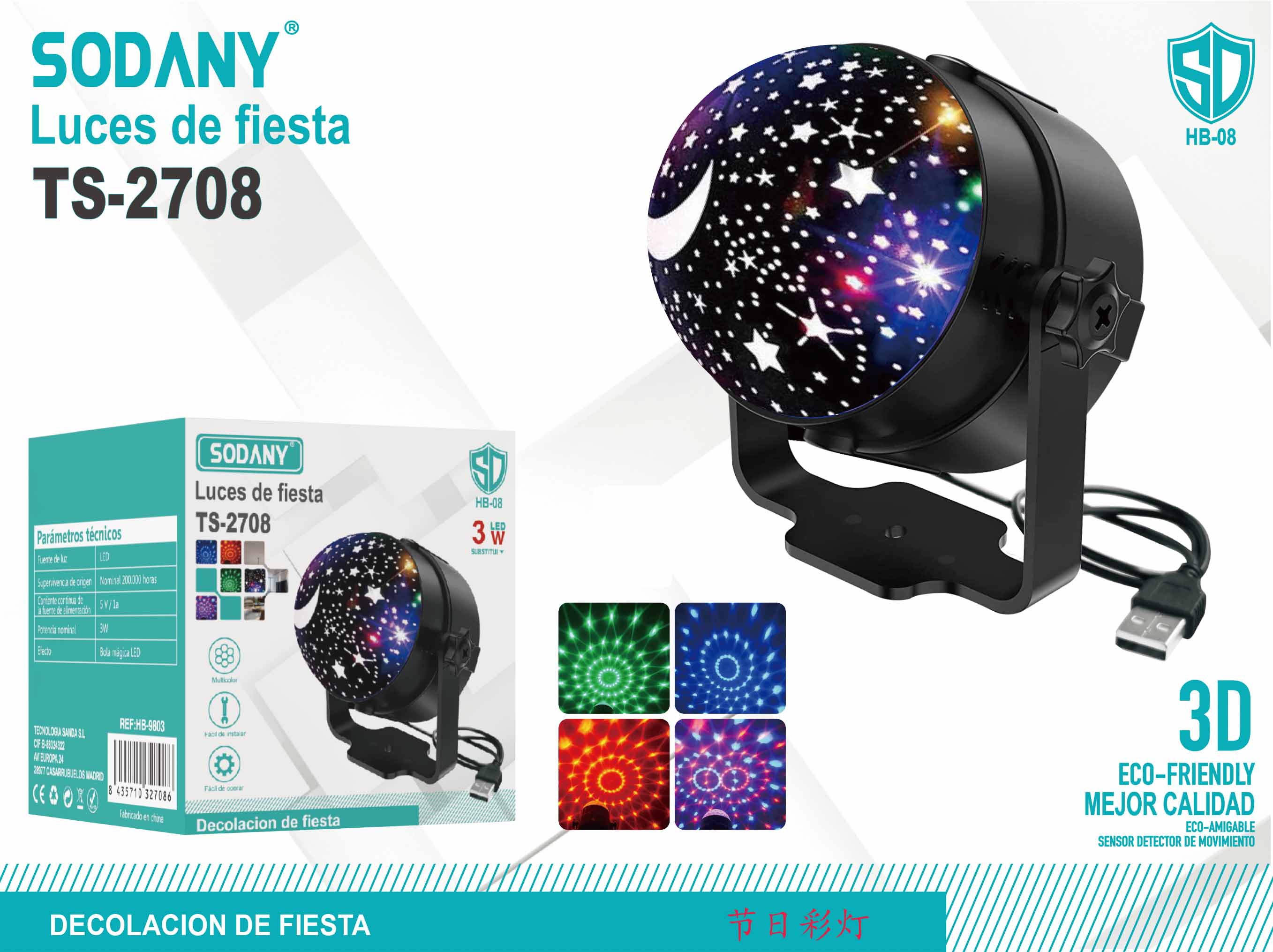 La lámpara de fiesta SODANY TS-2708 es perfecta para crear un ambiente festivo y animado en cualquier ocasión. Con su diseño único de cielo estrellado y su fácil uso, esta lámpara proyecta luces coloridas y giratorias, decorando el espacio con efectos visuales impactantes. Ideal para reuniones, fiestas, eventos o como decoración adicional para el hogar.