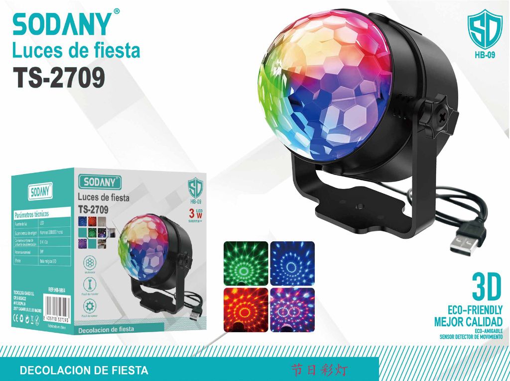 Las luces de fiesta SODANY TS-2709 están diseñadas para transformar cualquier espacio en una pista de baile. Con su diseño compacto y facilidad de uso, esta lámpara proyecta luces coloridas y dinámicas que crearán una atmósfera festiva y animada. Es ideal para eventos, fiestas o reuniones familiares, aportando un toque de diversión y color a cualquier ocasión.