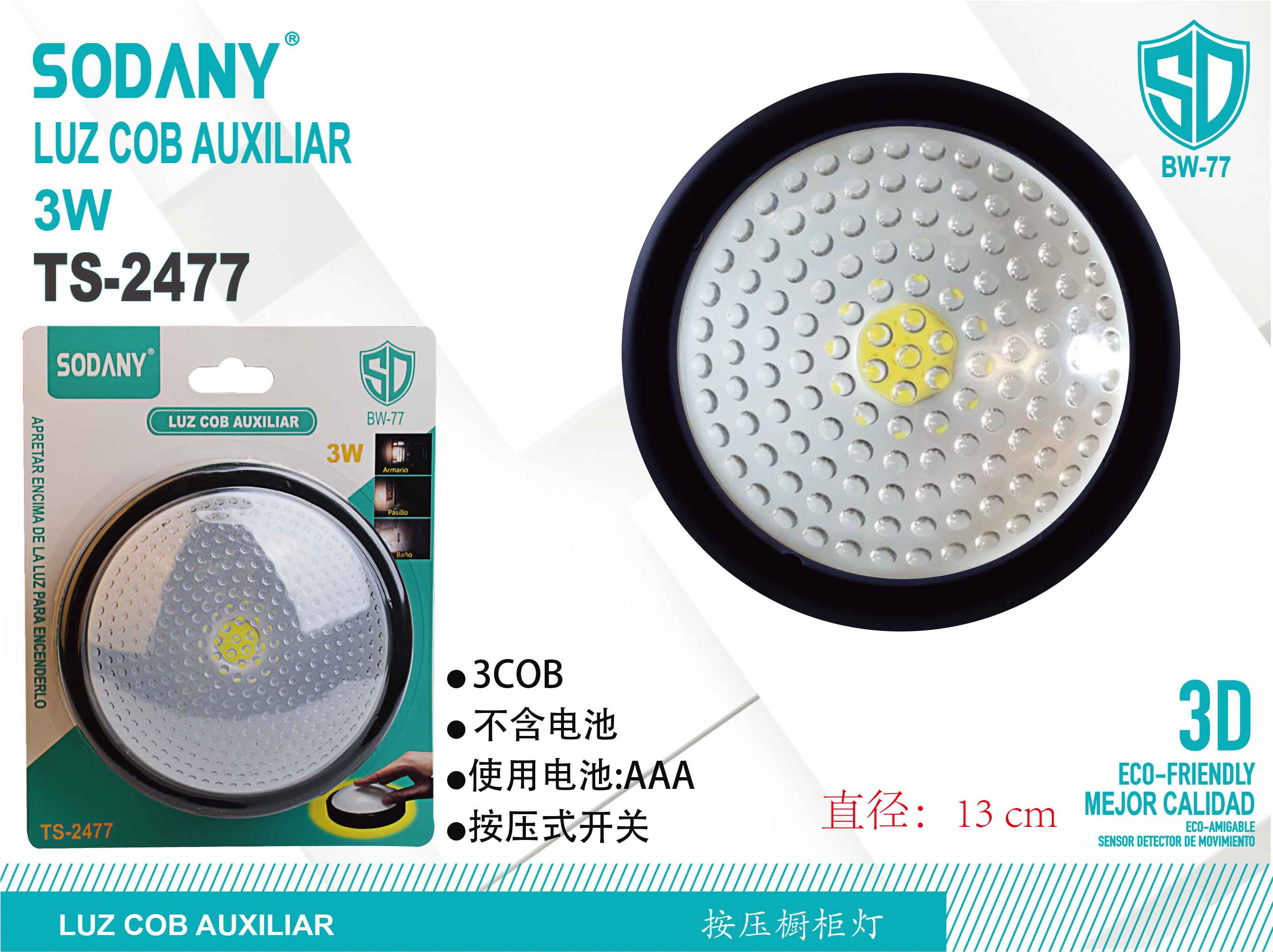 La luz COB auxiliar SODANY TS-2477 está diseñada para ofrecer una iluminación potente y eficiente en espacios oscuros. Con un diámetro de 13 cm y 3 luces COB, esta lámpara proporciona un brillo intenso ideal para closets, estantes y otros lugares que necesitan iluminación adicional.