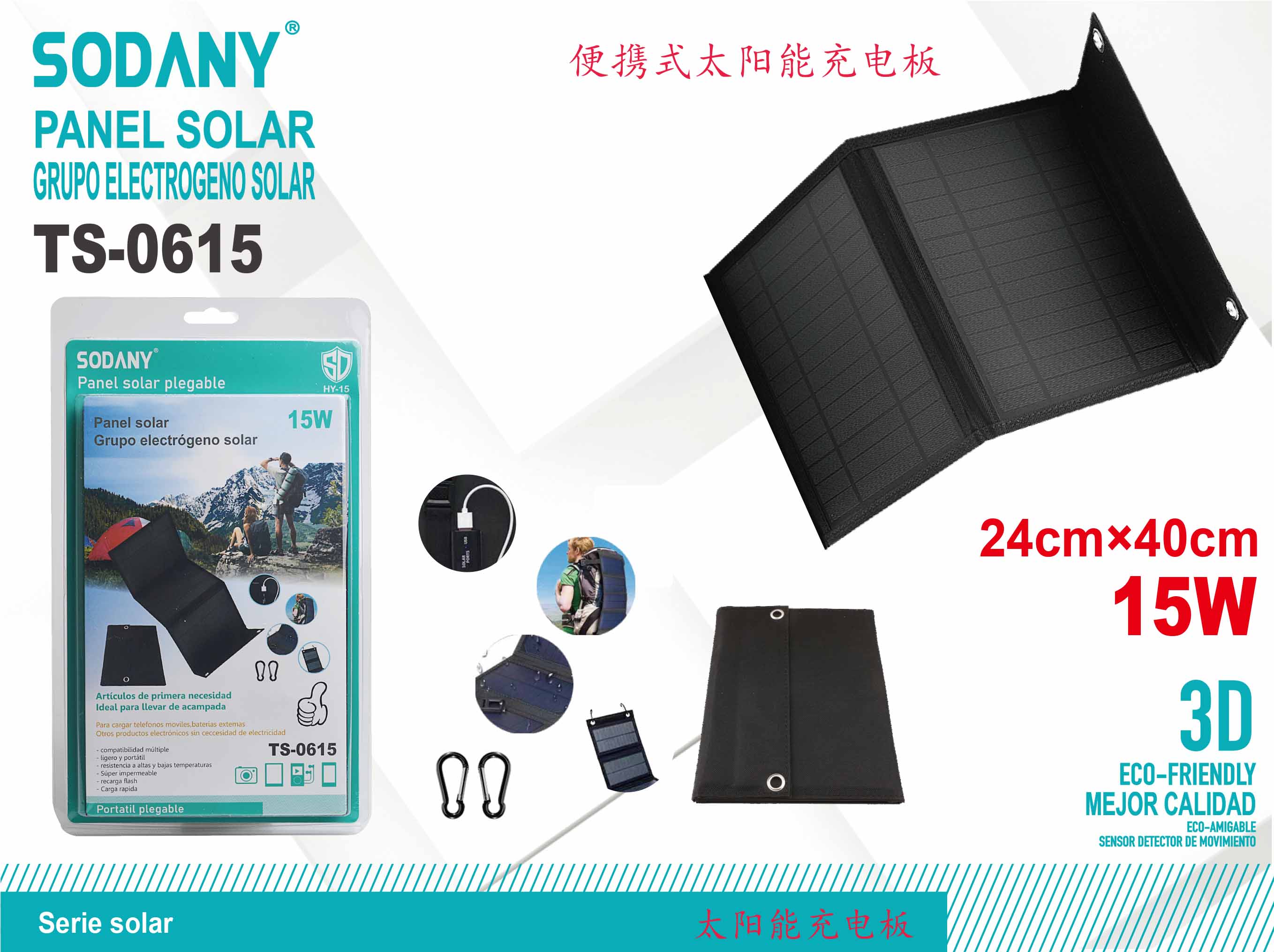 El Panel Solar Plegable SODANY TS-0615 es una solución eficiente y portátil para cargar dispositivos en cualquier lugar. Con su diseño plegable y ligero, es ideal para actividades al aire libre como camping, senderismo o viajes en bicicleta, permitiendo aprovechar la energía solar para mantener tus dispositivos electrónicos cargados. Su capacidad de 15W proporciona una carga rápida y eficaz.
