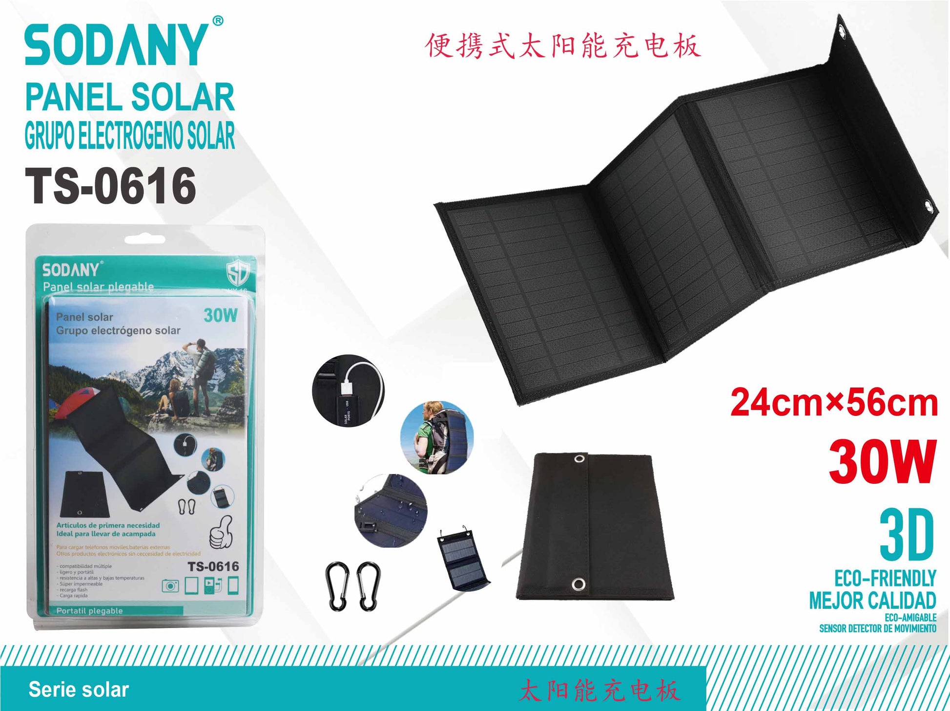 El Panel Solar Plegable SODANY TS-0616 con 30W de potencia es una solución perfecta para mantener tus dispositivos electrónicos cargados mientras disfrutas de actividades al aire libre. Con un diseño compacto y plegable, es ideal para camping, senderismo, y viajes largos. Es ligero y fácil de transportar, proporcionando una carga eficiente a partir de energía solar.