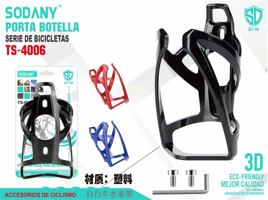 El porta botella SODANY TS-4006 está fabricado con plástico resistente de alta calidad, ofreciendo durabilidad y ligereza. Está diseñado para ajustarse a la mayoría de las bicicletas, brindando un soporte firme y seguro para botellas durante cualquier actividad ciclística. Disponible en varios colores, este accesorio combina estilo y funcionalidad, permitiendo una instalación sencilla y rápida.