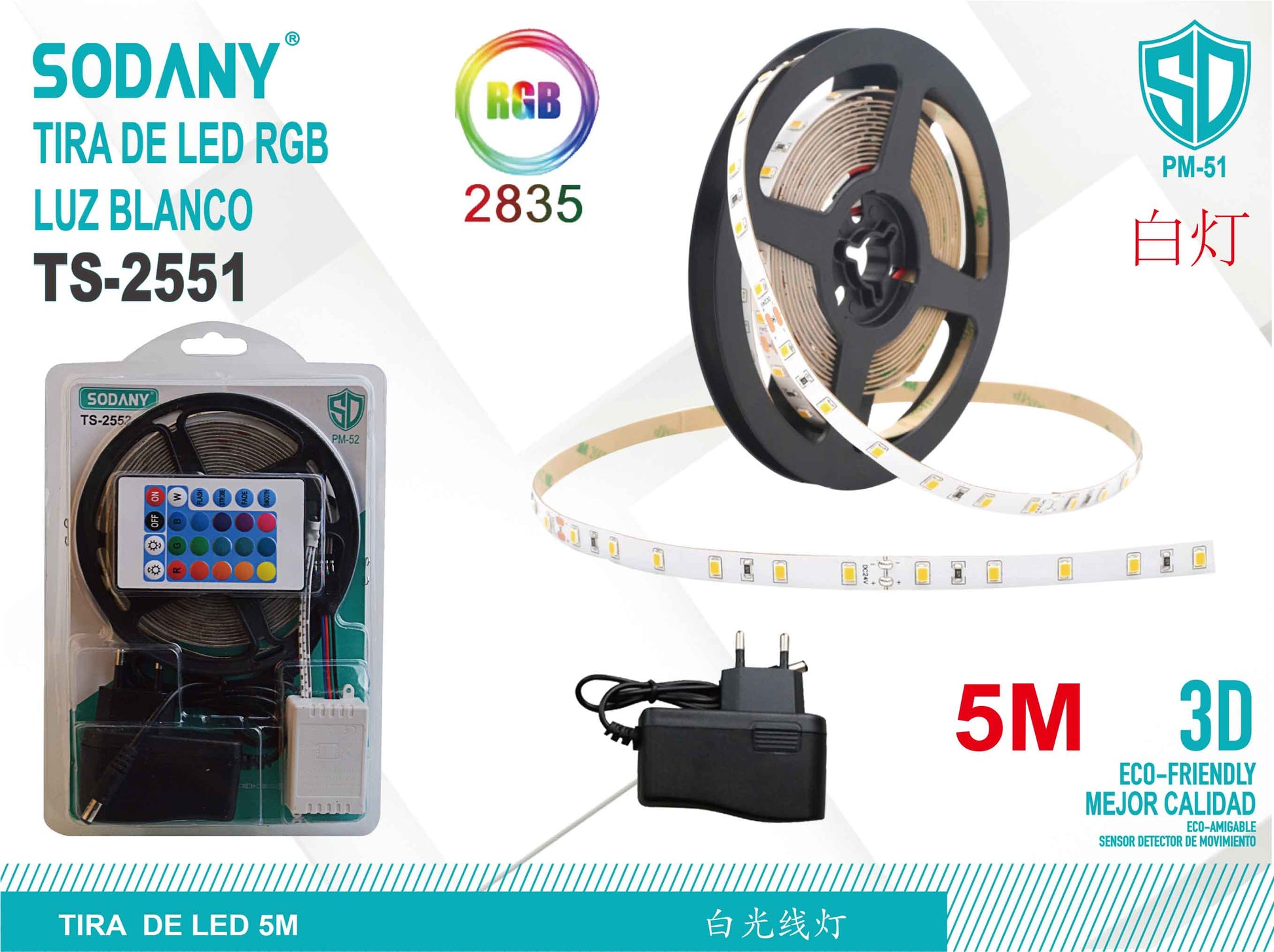 La tira de LED RGB SODANY TS-2551 con luz blanca es ideal para iluminar y decorar diferentes espacios del hogar u oficina. Su longitud de 5 metros permite una instalación versátil en muebles, techos o cualquier lugar donde se necesite una iluminación blanca cálida. Incluye un control remoto para cambiar el color y ajustar la intensidad, lo que la convierte en una opción perfecta para crear ambientes personalizados.
