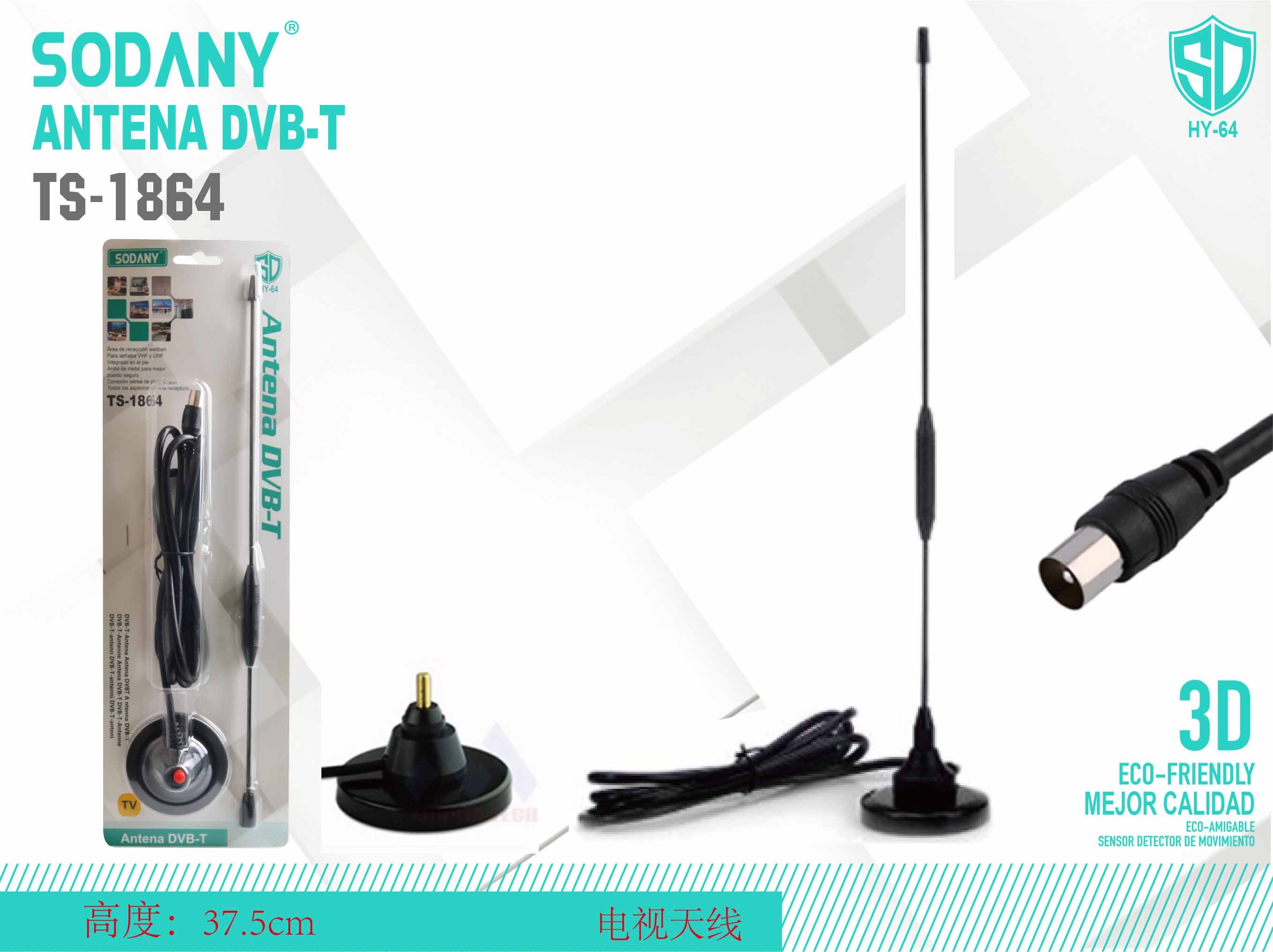 La Sodany TS-1864 es una antena DVB-T de alto rendimiento, diseñada para proporcionar una excelente recepción de señal en su televisor. Con un diseño delgado y altura de 37.5 cm, esta antena es ideal para cualquier hogar o espacio de trabajo.