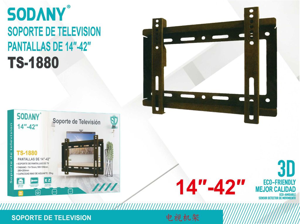 El Sodany TS-1880 es un soporte de pared robusto y confiable, diseñado para montar televisores de pantalla plana de 14 a 42 pulgadas. Es ideal para ahorrar espacio y asegurar tu televisor de manera segura en la pared, ofreciendo una visualización óptima.