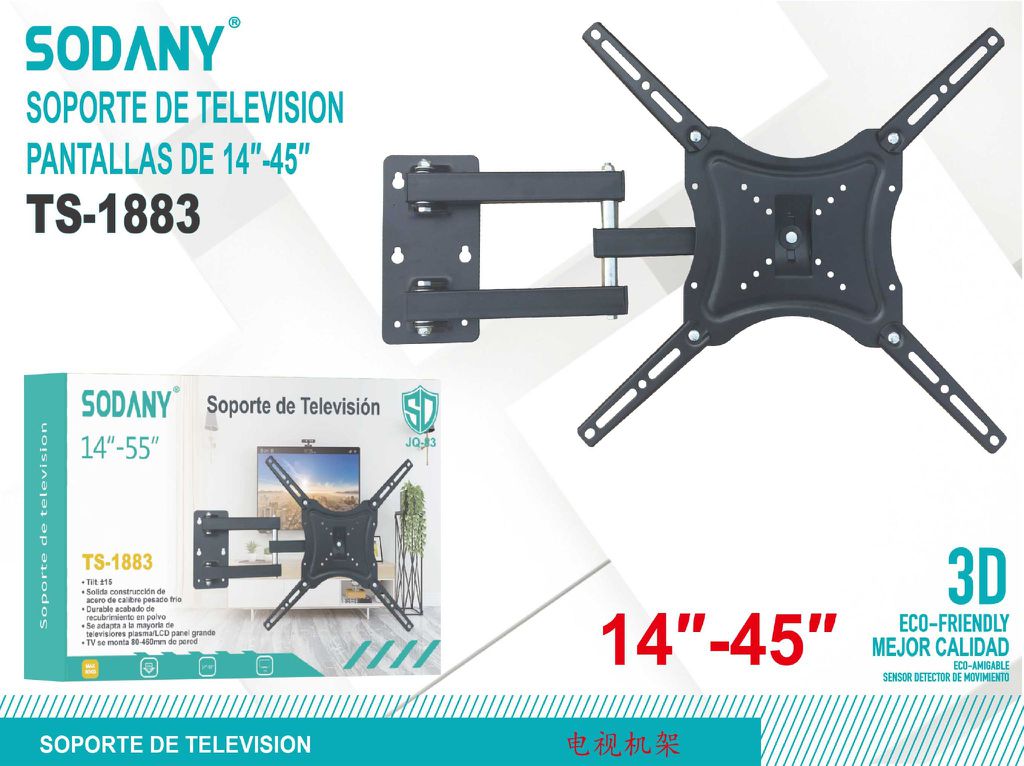 El Sodany TS-1883 es un soporte de pared robusto y ajustable, diseñado para televisores de pantalla plana de 14 a 45 pulgadas. Este soporte ofrece una solución eficiente para montar su televisor en la pared, mejorando la estética y la funcionalidad del espacio.