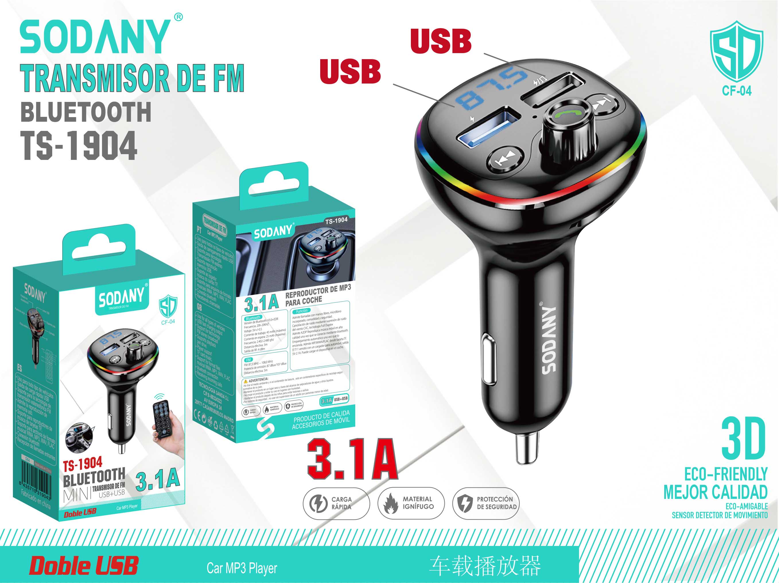 El Sodany TS-1904 es un avanzado transmisor de FM para coche que combina conectividad Bluetooth con puertos de carga dual USB. Este dispositivo permite disfrutar de música y llamadas manos libres en el coche con la mayor comodidad y calidad de sonido.
