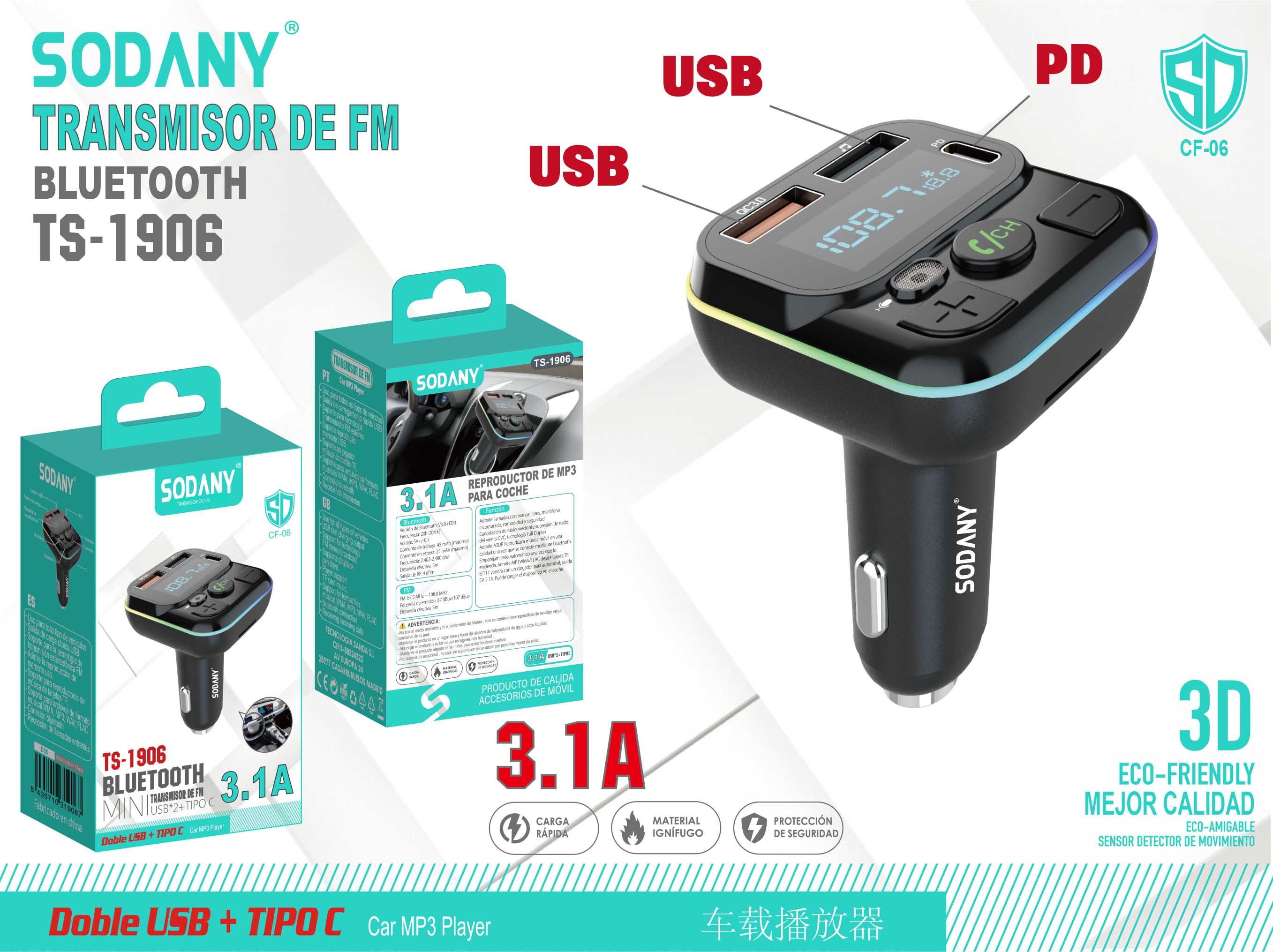 El Sodany TS-1906 es un avanzado transmisor de FM para coche que combina conectividad Bluetooth con puertos de carga dual USB y un puerto Tipo C. Este dispositivo permite disfrutar de música y llamadas manos libres en el coche con la mayor comodidad y calidad de sonido.