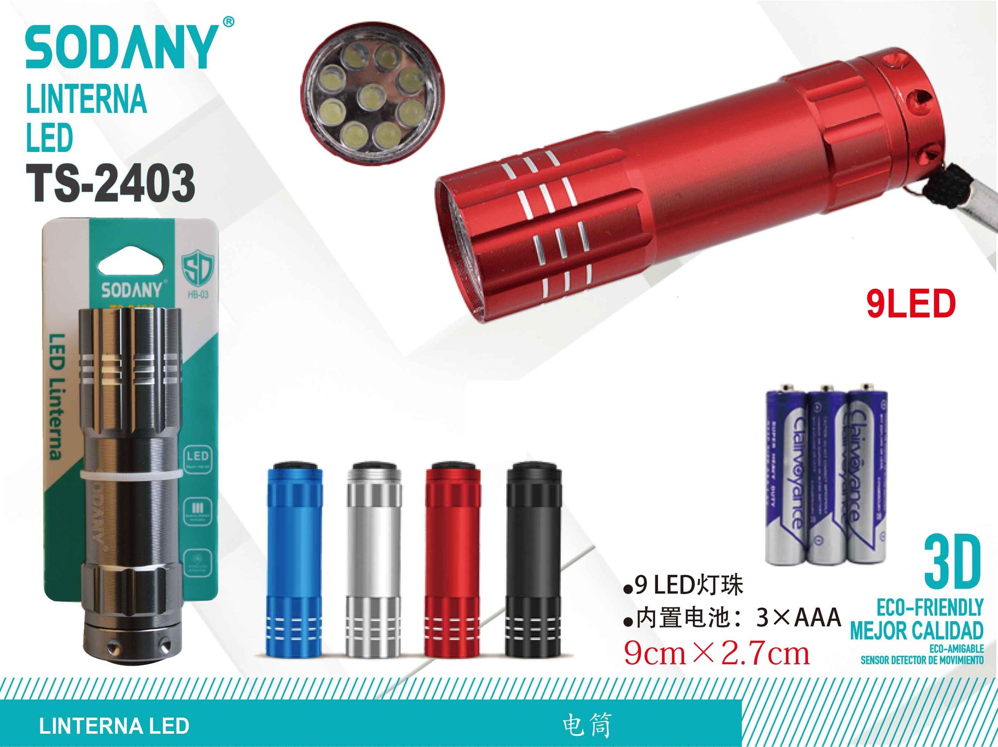 La linterna LED Sodany TS-2403 es una herramienta poderosa y compacta, equipada con 9 LED que proporcionan una iluminación intensa. Con un diseño portátil y resistente, esta linterna es perfecta para llevar en excursiones, acampadas o simplemente para tener en casa para cualquier emergencia. Funciona con 3 pilas AAA (incluidas) y su cuerpo está fabricado con materiales eco-friendly, garantizando durabilidad y un excelente rendimiento.