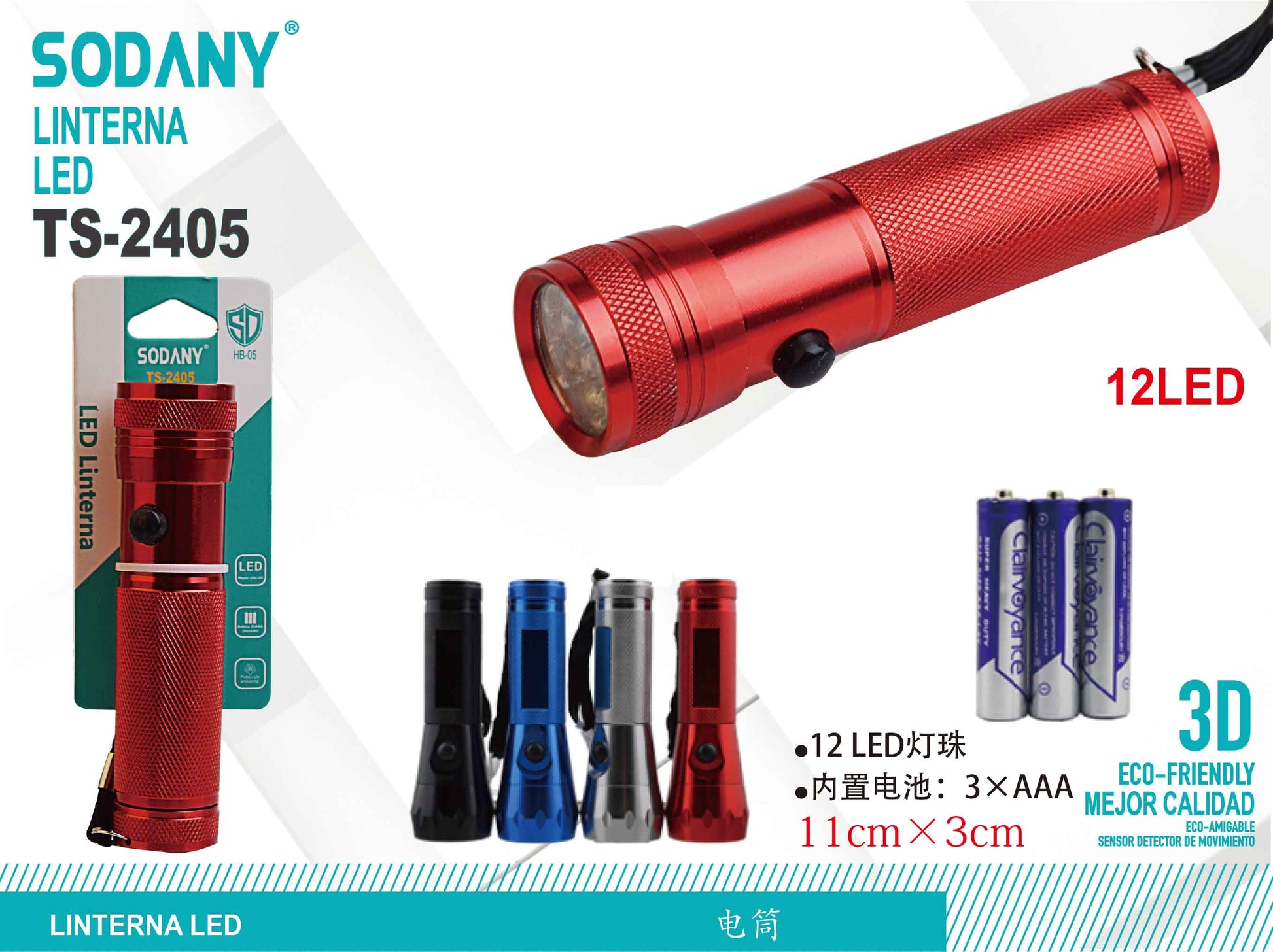 La linterna LED Sodany TS-2405 ofrece una iluminación potente gracias a sus 12 LEDs, proporcionando una luz brillante y clara en cualquier situación. Con su diseño robusto y compacto, esta linterna es perfecta para actividades al aire libre, acampadas, o para emergencias en el hogar. Funciona con 3 pilas AAA (incluidas), lo que garantiza un uso inmediato y eficiente.