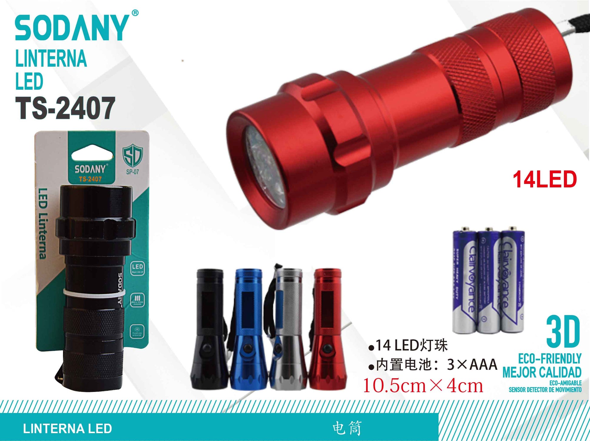 La linterna LED Sodany TS-2407 está equipada con 14 LEDs que ofrecen una iluminación excepcional en cualquier situación. Su diseño compacto y resistente la convierte en una opción ideal para actividades al aire libre, acampadas, o situaciones de emergencia. Con su construcción robusta y su tamaño manejable, esta linterna es práctica y fácil de transportar. Funciona con 3 pilas AAA (incluidas), garantizando un uso inmediato.