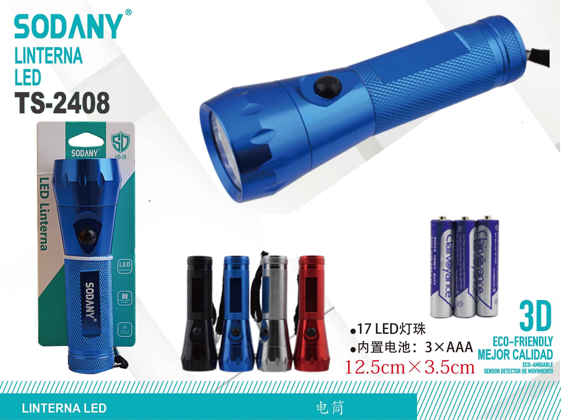 La linterna LED Sodany TS-2408 ofrece una potente iluminación gracias a sus 17 LEDs, lo que la convierte en la opción ideal para actividades al aire libre, acampadas, o situaciones de emergencia. Con un diseño robusto y resistente, esta linterna está fabricada con materiales eco-friendly que garantizan durabilidad y un excelente rendimiento. Funciona con 3 pilas AAA (incluidas), asegurando una experiencia lista para usar.