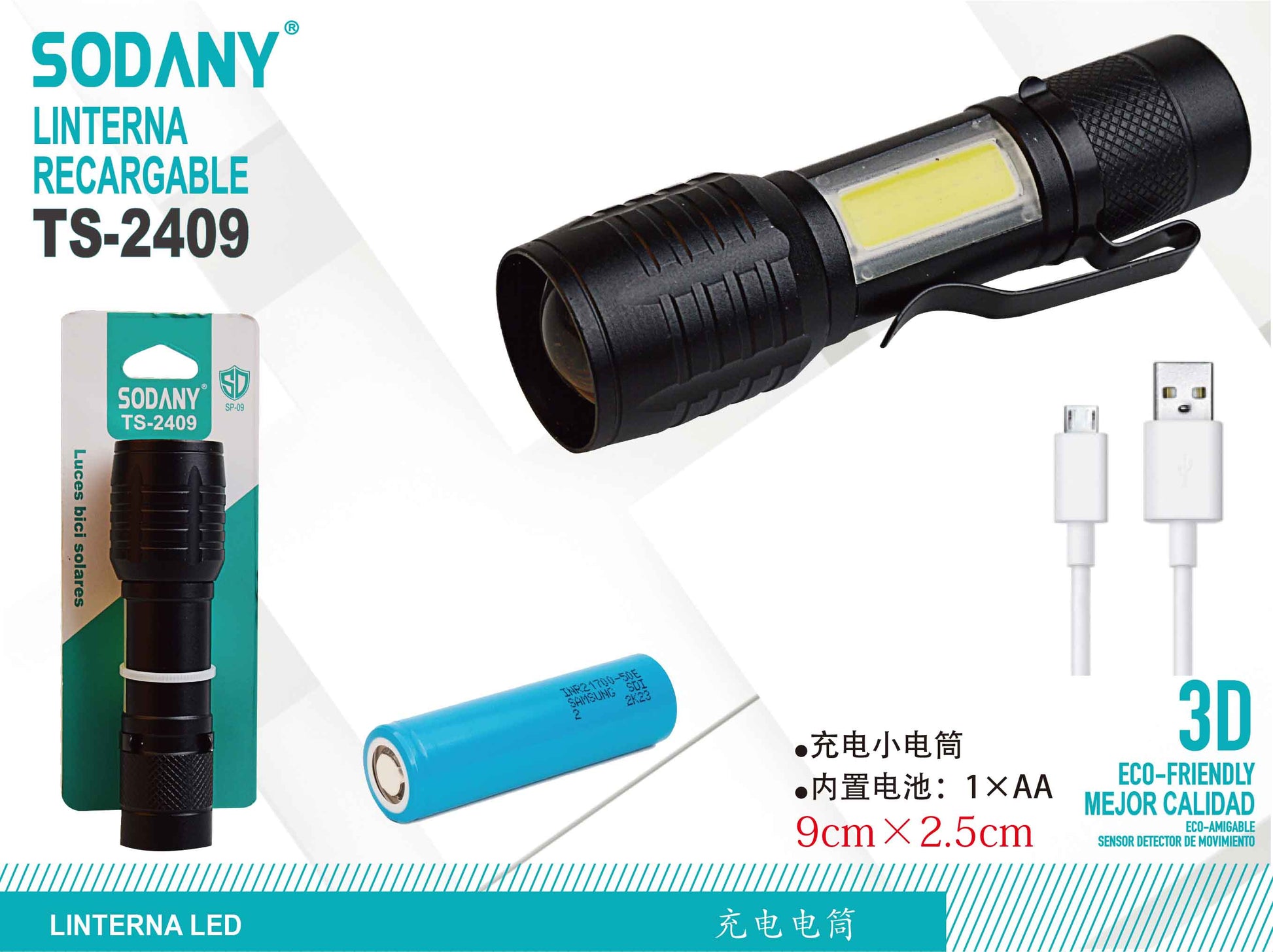 La linterna recargable Sodany TS-2409 es una herramienta compacta y potente equipada con tecnología LED COB para ofrecer una iluminación brillante y eficiente. Con su diseño portátil y resistente, esta linterna es perfecta para una amplia variedad de actividades, como acampadas, excursiones o uso en emergencias. Viene equipada con una batería recargable y un cable USB, lo que elimina la necesidad de pilas desechables, haciéndola eco-friendly y conveniente.