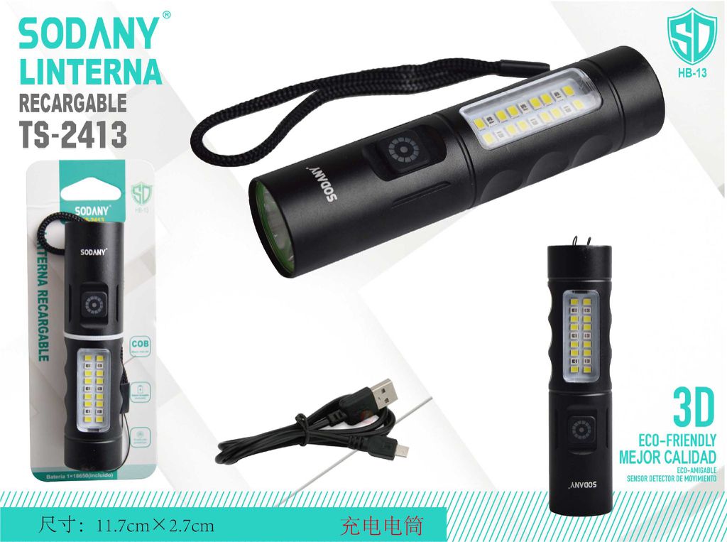 La linterna recargable Sodany TS-2413 es una herramienta compacta y versátil, ideal para diversas situaciones como campamentos, actividades al aire libre y emergencias. Equipada con tecnología LED COB, esta linterna ofrece una potente iluminación en un tamaño manejable. Además, incluye un cable USB para una recarga fácil y rápida, asegurando que siempre esté lista para usar.