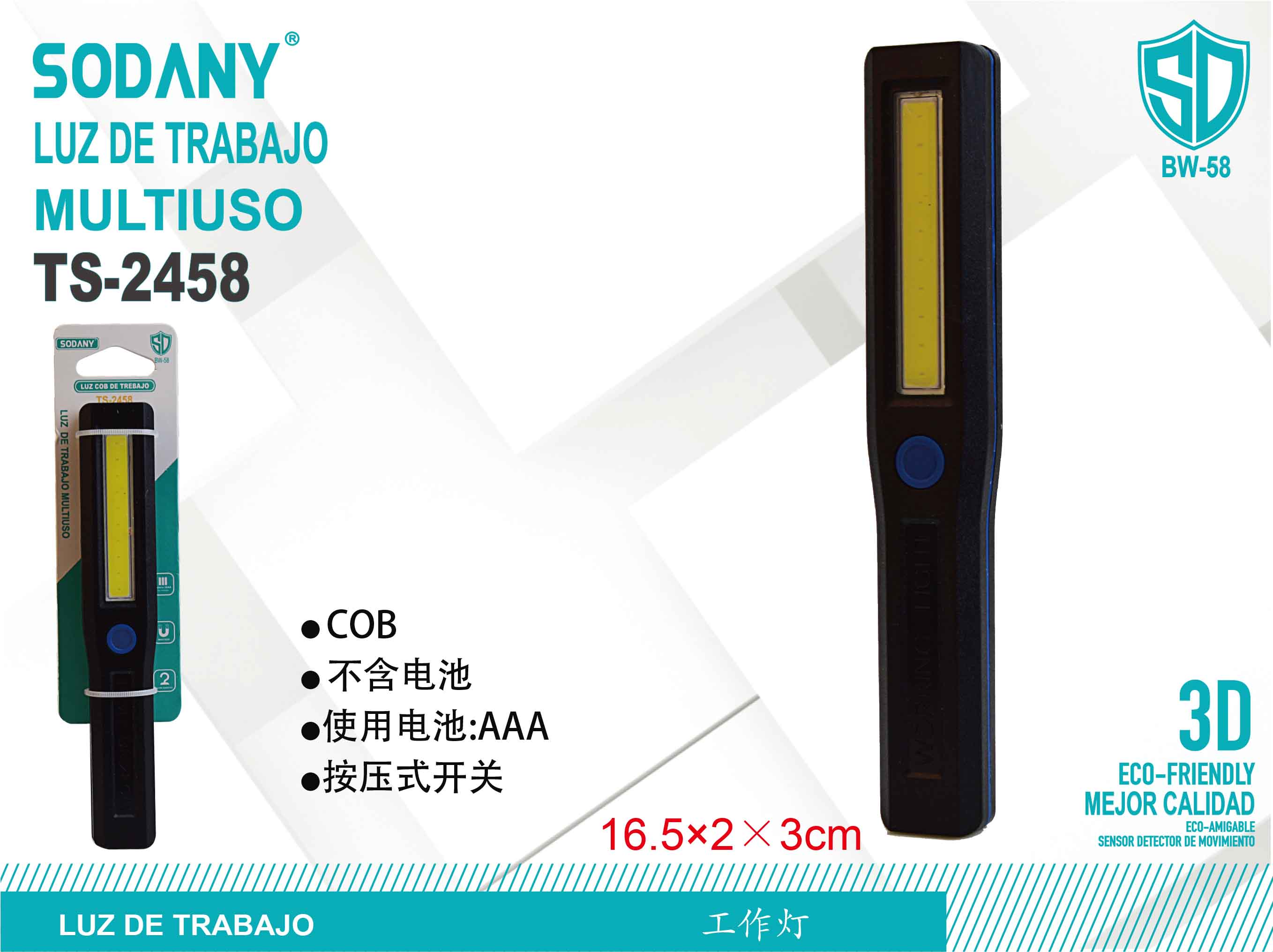 La luz de trabajo multiuso Sodany TS-2458 es una herramienta compacta y eficiente que proporciona una iluminación potente gracias a su tecnología LED COB. Con su diseño delgado y ergonómico, esta luz es perfecta para trabajos en espacios reducidos y áreas oscuras. Ideal para uso doméstico, trabajos mecánicos y actividades al aire libre.