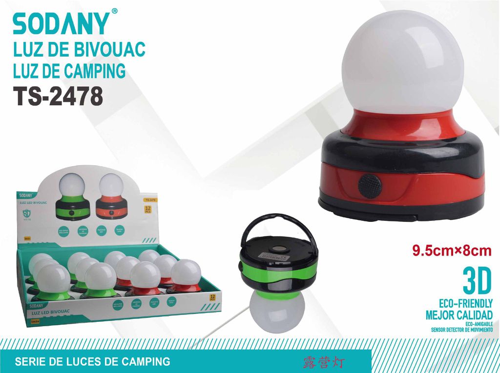 La luz de camping Sodany TS-2478 es una opción ideal para iluminar tiendas de campaña, actividades al aire libre o situaciones de emergencia. Su diseño compacto y portátil la hace fácil de llevar y usar en cualquier lugar. Con su luz suave y eficiente, es perfecta para crear un ambiente acogedor mientras proporciona la cantidad justa de iluminación para actividades nocturnas. Su estructura ecológica y amigable con el medio ambiente asegura un rendimiento duradero.