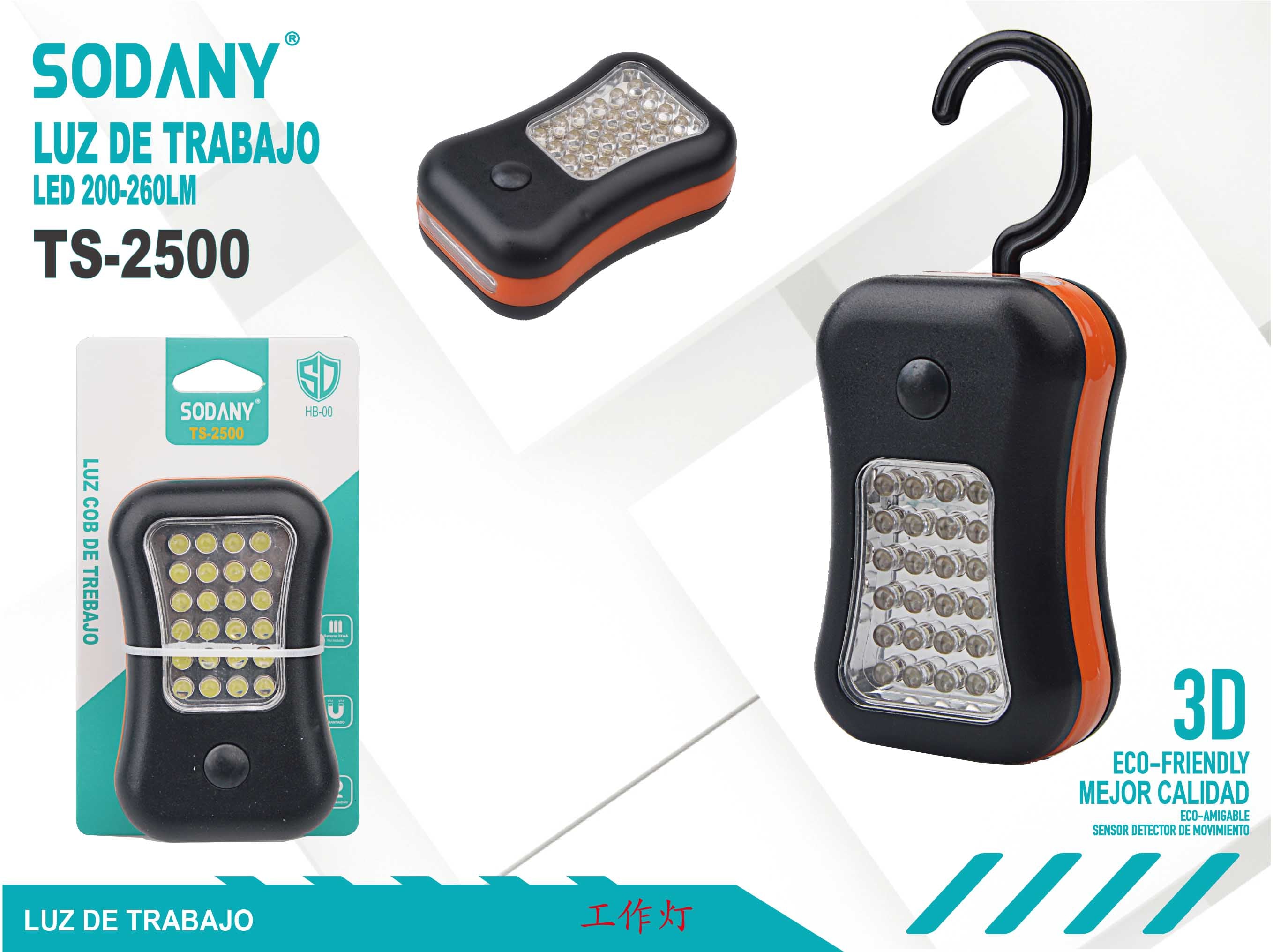 La luz de trabajo Sodany TS-2500 es una herramienta compacta y eficiente diseñada para proporcionar una iluminación brillante en espacios de trabajo. Equipada con tecnología LED COB, esta luz ofrece hasta 260 lúmenes, siendo ideal para trabajos de mantenimiento, emergencias o actividades al aire libre. Con un diseño magnético y gancho incorporado, es fácil de fijar en superficies metálicas o colgar para trabajar con las manos libres.