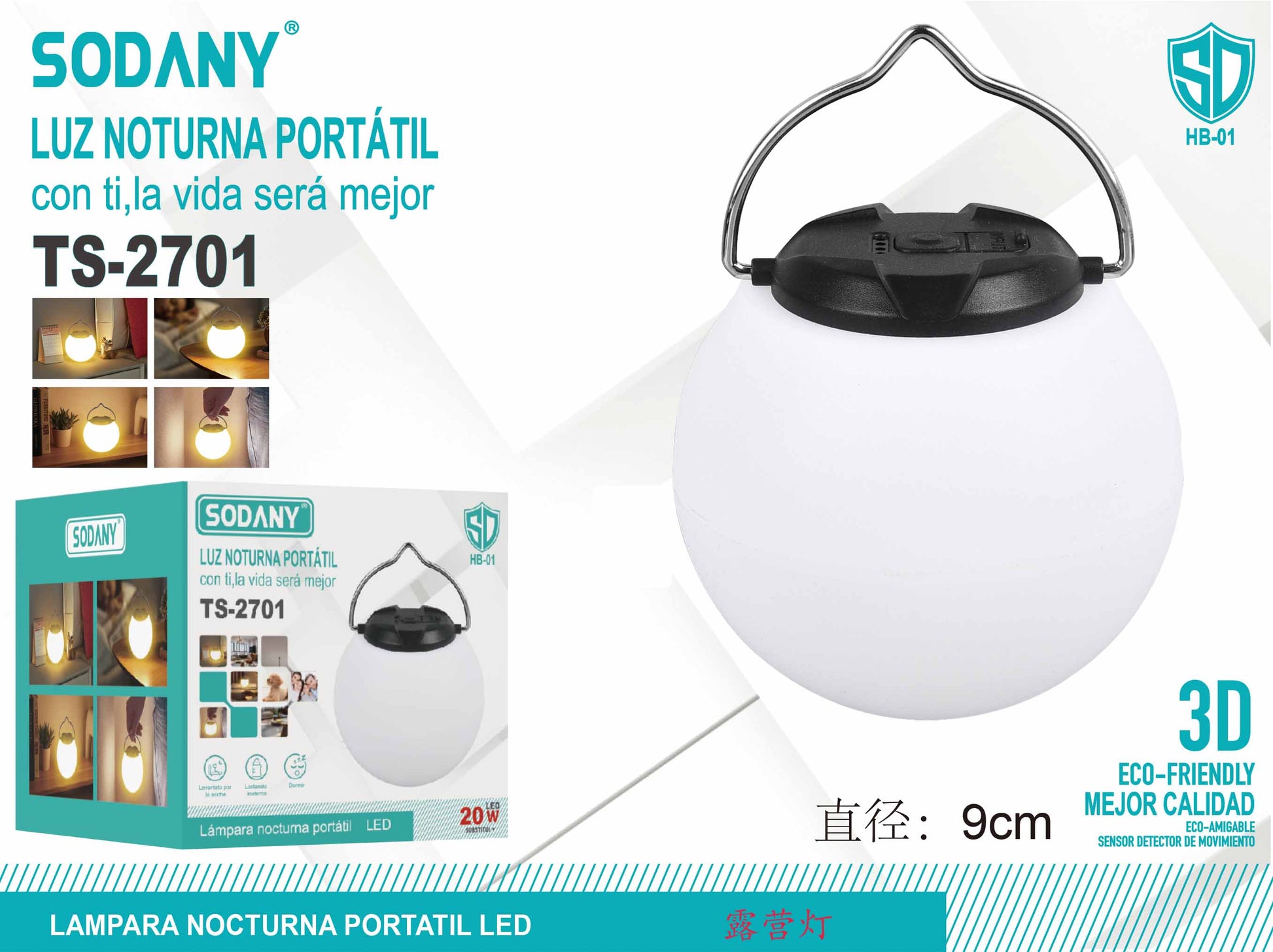 La luz nocturna portátil Sodany TS-2701 es ideal para cualquier espacio que requiera una iluminación suave y ambiental. Con su diseño moderno y práctico, esta lámpara proporciona luz suave y es fácil de llevar a cualquier lugar. Perfecta para su uso en interiores o exteriores, como campamentos, dormitorios o zonas de ocio.