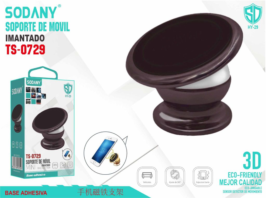 El Soporte de Móvil Imantado Sodany TS-0729 es una solución compacta y elegante para sujetar tu smartphone en el coche. Este soporte utiliza un potente imán y una base adhesiva para asegurar tu dispositivo de manera estable en cualquier superficie plana del vehículo.
