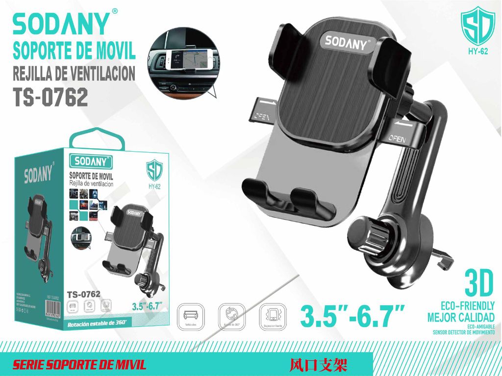 El Soporte de Móvil para Coche Sodany TS-0762 es un soporte ajustable que se instala en la rejilla de ventilación del coche, diseñado para dispositivos móviles de 3.5" a 6.7". Proporciona una sujeción firme y segura para tu móvil, permitiendo un acceso fácil y conveniente mientras conduces.
