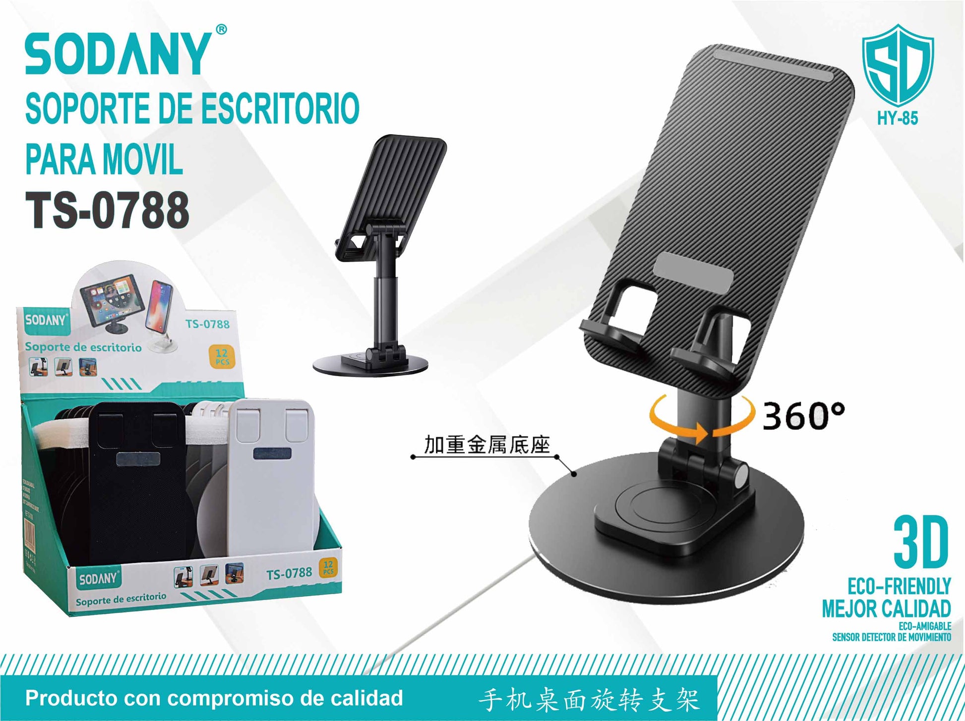 El Soporte de Móvil para Escritorio Sodany TS-0788 es la solución perfecta para mantener tu dispositivo móvil en una posición cómoda y accesible mientras trabajas, estudias o disfrutas de contenido multimedia. Este soporte cuenta con un diseño robusto y elegante, y una base con rotación de 360 grados para facilitar el ajuste del ángulo de visión según tus necesidades.