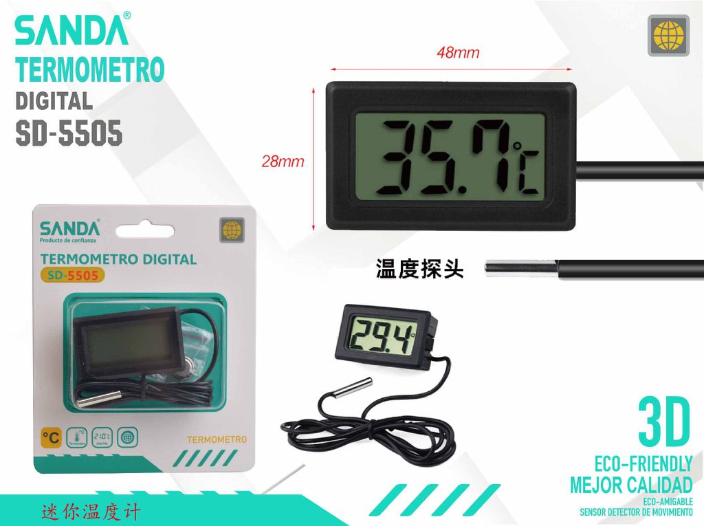 El termómetro digital Sanda SD-5505 es una herramienta precisa y fácil de usar, ideal para medir la temperatura en diversos entornos. Con su diseño compacto y una pantalla digital clara, este termómetro ofrece lecturas rápidas y confiables. El sensor de temperatura externo permite una medición precisa en lugares de difícil acceso, lo que lo hace ideal para su uso en refrigeradores, acuarios, terrarios y otros espacios.