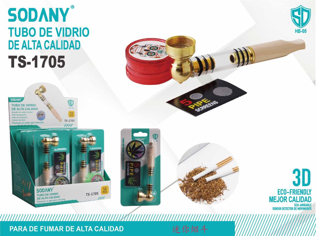 El Tubo de Vidrio de Alta Calidad Sodany TS-1705 es un conjunto completo que incluye tanto un tubo de vidrio como un molinillo, ofreciendo una experiencia de fumado superior. Este producto está diseñado para aquellos que buscan calidad, durabilidad y conveniencia en un solo paquete.